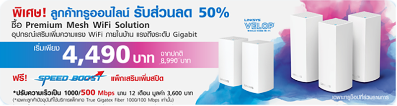 สิทธิพิเศษสำหรับลูกค้าทรูออนไลน์ทุกราย  รับส่วนลด 50 % เมื่อซื้อ Linksys Velop รุ่น Dual Band และ Tri Band พร้อมรับฟรี Speed Boost แพ็กเสริมเพิ่มสปีด ปรับความเร็วเพิ่มขึ้นให้ฟรี นานถึง 12 เดือน มูลค่า 3,600 บาท (สำหรับลูกค้า True Gigatex Fiber 1000/100 Mbps.)