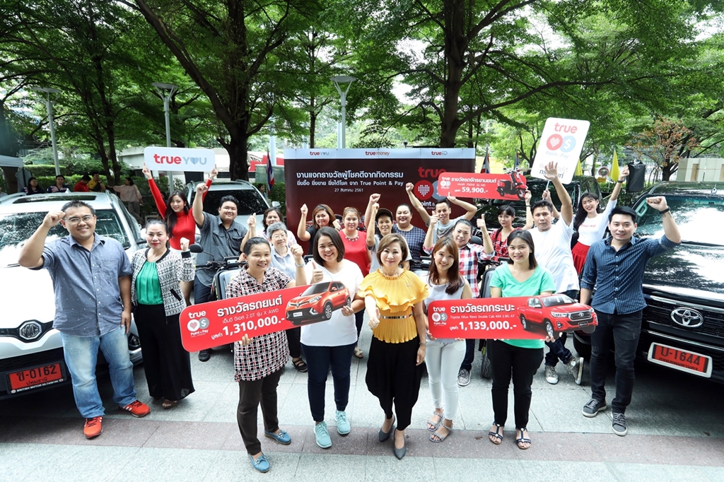 กลุ่มทรู โดย นางนันทิญา อังคณากานต์ (แถวหน้า กลาง) รองผู้อำนวยการฝ่ายลูกค้าสัมพันธ์ และบริหารความสุขลูกค้า บริษัท ทรู คอร์ปอเรชั่น จำกัด มหาชน มอบรางวัลให้กับลูกค้ากลุ่มทรูผู้โชคดีที่ใช้จ่ายผ่านแอป “ทรู สมาร์ต เมอร์ชันต์” จากกิจกรรม “True Point & Pay ยิ่งซื้อ ยิ่งขาย ยิ่งได้โชค ทั้งร้านค้าและลูกค้า” โดยผู้ใช้แอปลุ้นรับโชคได้ทุกวัน เมื่อใช้จ่ายในร้านค้าที่มีสัญลักษณ์ True Point & Pay เพียงสแกน QR Code ของร้านเพื่อชำระเงินผ่าน ทรูมันนี่ วอลเล็ท ในแอปทรูไอดี ได้ทันที ปลอดภัย ไม่ต้องใช้เงินสด โดยรางวัลที่มอบให้กับผู้โชคดี ได้แก่ รางวัลรถยนต์ MG GS 2.0T รุ่น X AWD มูลค่า 1,310,000 บาท จำนวน 4 รางวัล รางวัลรถกระบะ Toyota Hilux Revo Double Cab 4X4 2.8G AT มูลค่า 1,139,000 บาท จำนวน 4 รางวัล รางวัลรถจักรยานยนต์ Yamaha QBIX รุ่น ABS มูลค่า 59,900 บาท จำนวน 60 รางวัล และรางวัลอื่นๆ อีกมากมาย รวมมูลค่ากว่า 20 ล้านบาท ณ อาคารทรูทาวเวอร์ รัชดา เมื่อเร็วๆนี้