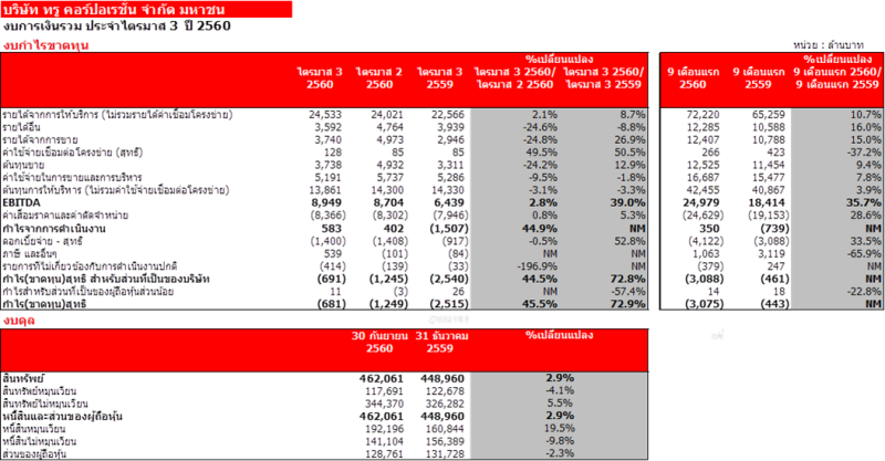 กลุ่มทรู มีรายได้จากการให้บริการโดยรวมเพิ่มขึ้นเป็น 24.5 พันล้านบาท ส่วนใหญ่เป็นผลจากการเติบโตอย่างแข็งแกร่งและต่อเนื่องของทรูมูฟ เอช ซึ่งมีรายได้จากบริการนอนวอยซ์และฐานลูกค้าที่เพิ่มสูงขึ้นทั้งในกลุ่มลูกค้าระบบรายเดือนและเติมเงิน ซึ่งผลักดันให้ EBITDA ของกลุ่ม เติบโตประมาณร้อยละ 39.0 จากช่วงเวลาเดียวกันปีก่อนหน้า เป็น 8.9 พันล้านบาท ในขณะที่ EBITDA Margin ยังคงแข็งแกร่งที่ประมาณร้อยละ 36.5 ในไตรมาส 3 ปี 2560 กลุ่มทรู รายงานผลขาดทุนจำนวน 691 ล้านบาท ปรับตัวดีขึ้นอย่างมีนัยสำคัญ เมื่อเทียบกับผลขาดทุนจำนวน 2.5 พันล้านบาท ในไตรมาสเดียวกันของปีก่อนหน้า อันเป็นผลจากกำไรการดำเนินงานที่เพิ่มขึ้น เนื่องจากมาตรการควบคุมค่าใช้จ่ายให้ผลลัพธ์ที่ดีและมีประสิทธิภาพสูงขึ้น