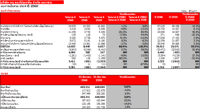 บมจ. ทรู คอร์ปอเรชั่น รายงานผลการดำเนินงานที่เติบโต และสามารถทำกำไรได้ 5.4 พันล้านบาทในไตรมาส 4 และ 2.3 พันล้านบาทสำหรับทั้งปี 2560 อันเป็นผลจากรายได้และEBITDA ที่เพิ่มขึ้นแข็งแกร่งจนเป็นจำนวนสูงสุดในประวัติการณ์ รวมทั้งความต่อเนื่องในการลดต้นทุน เพิ่มประสิทธิภาพการทำงานทั่วทั้งองค์กร และผลสำเร็จจากการจำหน่ายสินทรัพย์ให้แก่กองทุนรวมโครงสร้างพื้นฐานโทรคมนาคม ดิจิทัล ทั้งนี้ ที่ประชุมคณะกรรมการบริษัทฯ ได้อนุมัติการจ่ายเงินปันผล จำนวนทั้งสิ้นประมาณ 1 พันล้านบาท คิดเป็น 0.031 บาทต่อหุ้น โดยจะนำเสนอที่ประชุมสามัญผู้ถือหุ้นในเดือนเมษายนนี้