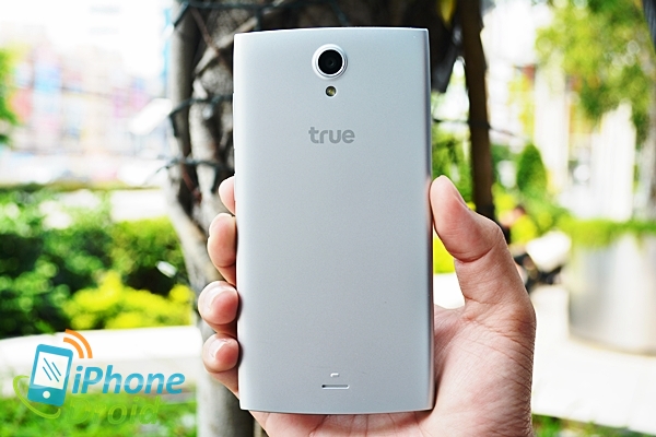 ด้านหลังมีเลนส์กล้องความละเอียด 13 ล้านพิกเซล พร้อมแฟลชแบบ LED ถัดลงมามีโลโก้ True และช่องสำหรับเสียงลำโพง
