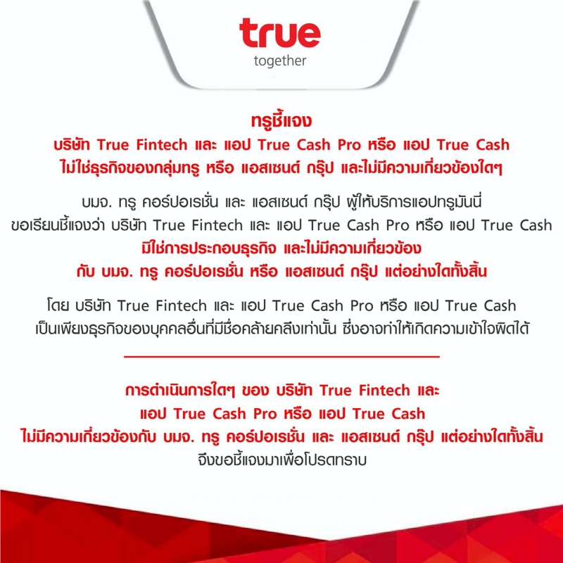 ทั้งนี้ การดำเนินการใดๆของ บจก.ทรู ฟินเทค แอปพลิเคชัน TRUE CASH PRO และแอปพลิเคชั่น TRUE CASH ไม่มีความเกี่ยวข้องกับ บมจ.ทรู คอร์ปอเรชั่น และแอสเซนด์ กรุ๊ป แต่อย่างใดทั้งสิ้น จึงขอชี้แจงมาเพื่อโปรดทราบ