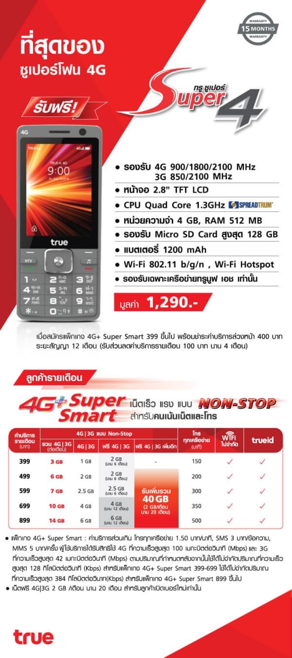 ลูกค้าแบบรายเดือน TrueMove H รับเครื่อง True Super 4 ฟรี เพียงสมัครแพ็กเกจ 4G Plus Super Smart 399 ขึ้นไป พร้อมชำระค่าบริการล่วงหน้า 400 บาท ซึ่งจะนำไปลดค่าบริการรายเดือน 100 บาท 4 เดือน และมีสัญญาการใช้งาน 12 เดือน รับสิทธิได้ตั้งแต่วันนี้ – 31 ธันวาคม 2559 ที่ทรูช้อปทุกสาขา อย่าลืมเตรียมบัตรประชาชนไปด้วยนะครับ