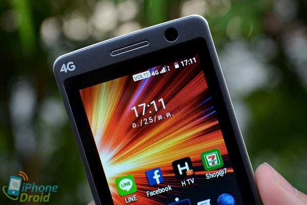 เหนือหน้าจอบริเวณมุมซ้ายจะมีสัญลักษณ์ 4G เพื่อบอกว่ารุ่นนี้ใช้งานบนเครือข่าย 4G ได้ ถัดมาตรงกลางจะเป็นช่องลำโพงสำหรับเสียงสนทนาขณะโทร และเลนส์กล้องหน้า