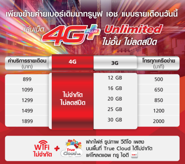 โดยแต่ละแพ็กเกจจะใช้งาน 4G+ ได้ไม่อั้น ไม่ลดสปีด แพ็กเก็จเริ่มต้น 899 บาท ค่าโทรเริ่มต้น 500 นาที, เน็ต 3G เริ่มต้น 12GB เมื่อใช้งานบนเครือข่าย 3G ความเร็วสูงสุด 42 Mbps. (ในกรณีที่ใช้ 3G ไม่หมด ไม่สามารถทบไปใช้ในเดือนถัดไปได้) และมี TRUE WIFI ความเร็วสูงสุด 200 Mbps. แบบไม่จำกัดปริมาณการใช้งานให้ด้วยทุกแพ็กเกจ