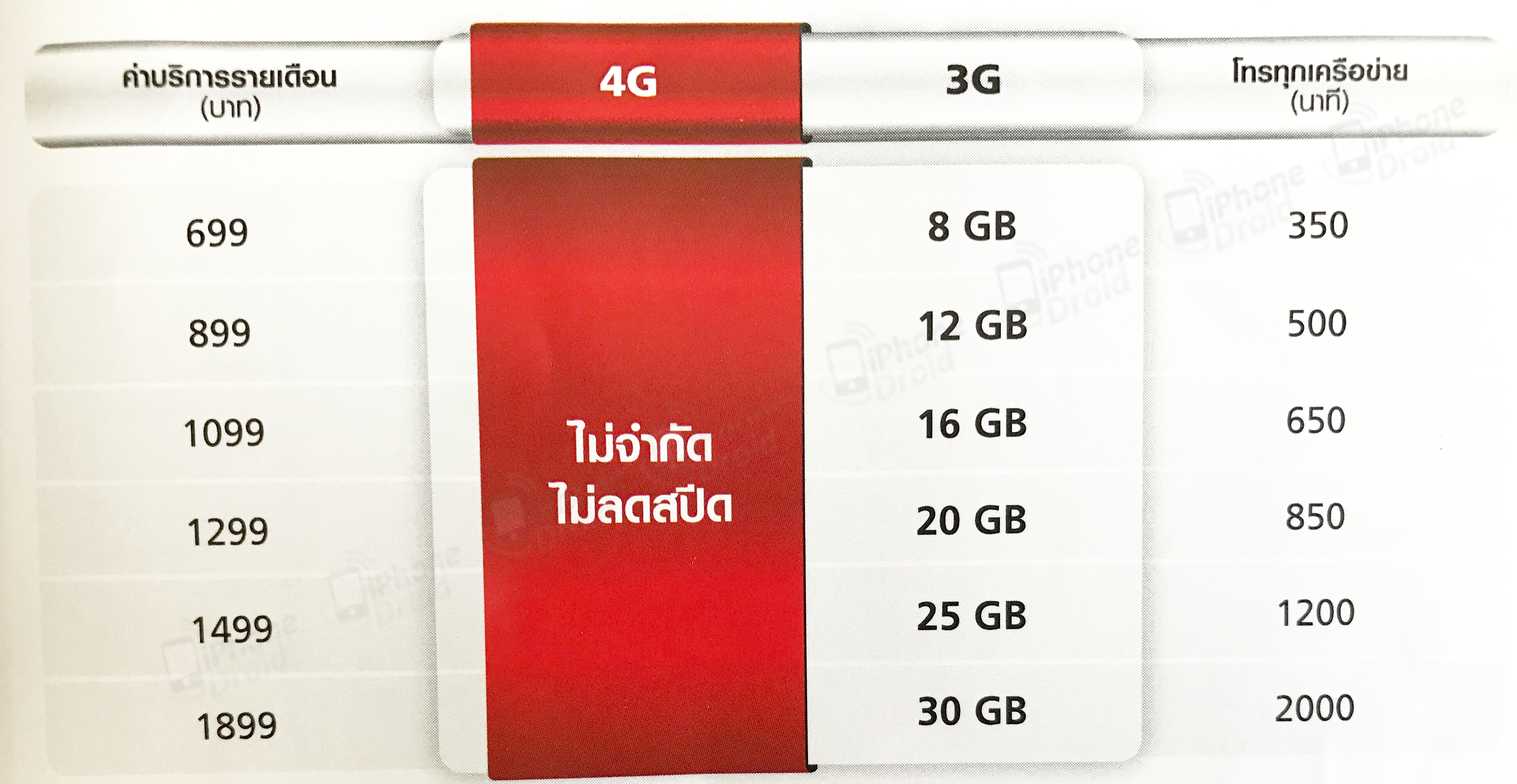 | ค่าบริการรายเดือน | 4G | 3G | โทรทุกเครือข่าย | Wi-Fi |