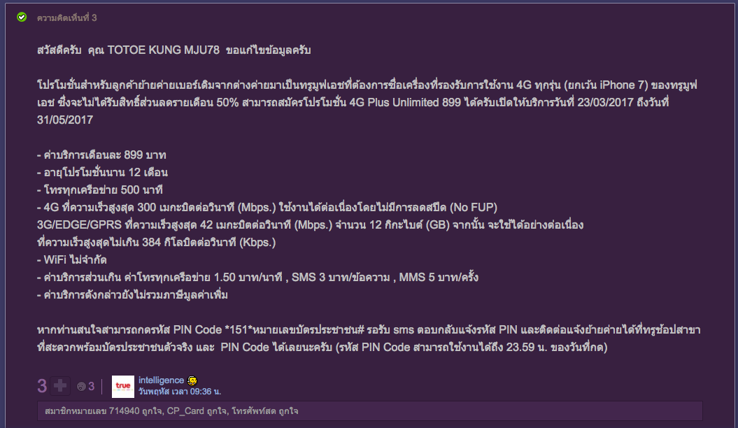 โปรโมชั่น 4G Plus Unlimited เริ่มวันแรกในวันที่ 23 มีนาคมที่ผ่านมานี้ ซึ่งมีผู้ใช้งานในเว็บไซต์ Pantip ได้ตั้งกระทู้ถามไปยัง Truemove H ว่ามีรายละเอียดอย่างไร ก็ได้คำตอบว่า
