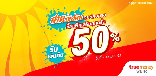 ทรูมูฟ เอช ร่วมกับ ทรูมันนี่ วอลเล็ท จัดหนักเฉพาะเมษานี้เท่านั้น!!! ลูกค้า TrueMove H แบบเติมเงิน สมัครแพ็กเกจเสริม แพ็กเกจใดก็ได้ที่มีระยะเวลาการใช้งานไม่เกิน 7 วัน จากทุกช่องทาง รับเงินคืนเข้าบัญชี TrueMoney Wallet 50% ทันที รวมสูงสุด 100 บาท / เดือน