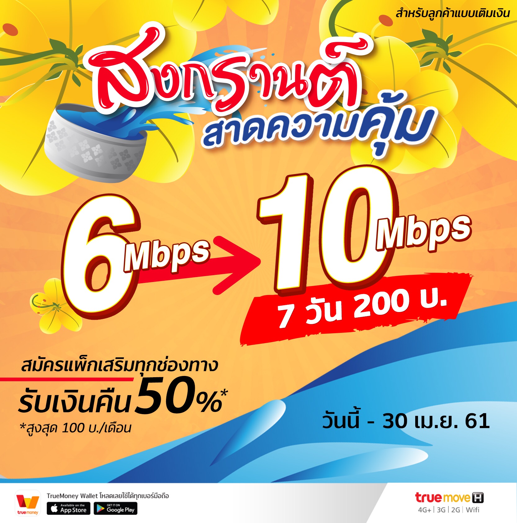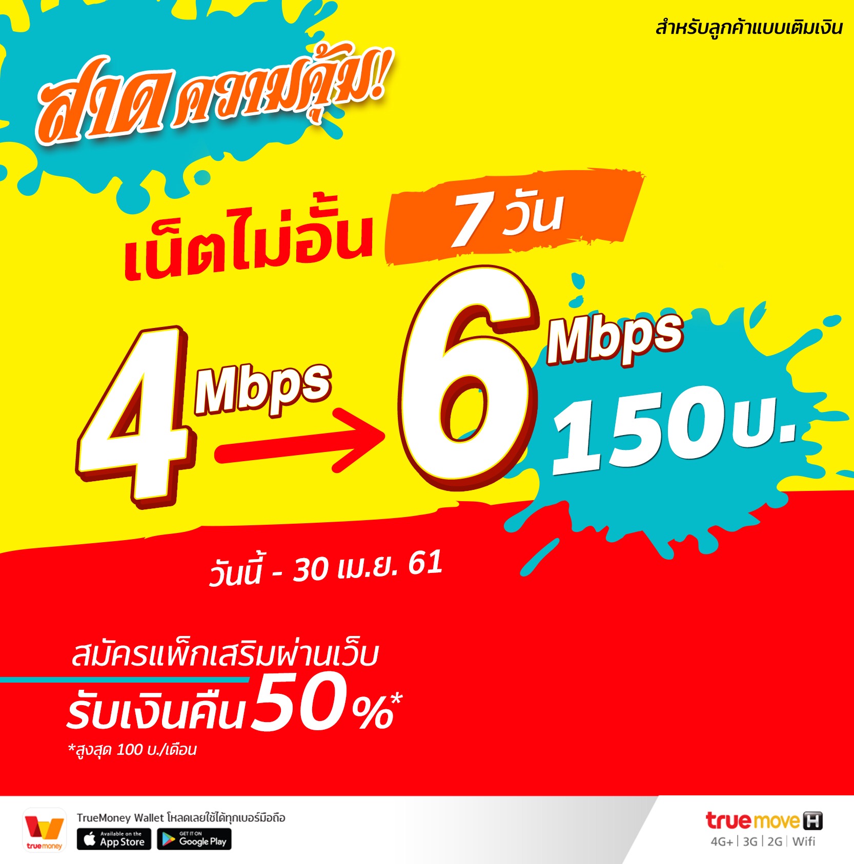 ข่าวดีสำหรับผู้ใช้ทรูมูฟ เอช แบบเติมเงิน สมัครแพ็กเกจเสริมทุกช่องทาง ได้รับเงินคืนสูงสุด 50% (สูงสุด 100 บาท ต่อเดือน) พร้อมรับความเร็วสปีดเพิ่ม