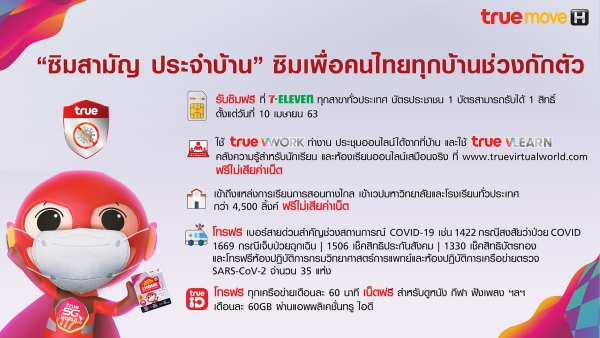 ช่วงสถานการณ์โควิด-19 ให้ทรูดูแลไทย โดยทรูมูฟ เอช ได้ออกแบบซิมพิเศษ “ซิมสามัญ ประจำบ้าน” เพื่อมอบฟรีให้คนไทย ใช้ติดต่อ ทำงานที่บ้าน เรียนที่บ้าน และสนุกได้ที่บ้าน สนับสนุนทุกการใช้ชีวิตอยู่ที่บ้านให้สบายใจและรู้สึกปลอดภัยยิ่งขึ้น โดยซิมนี้