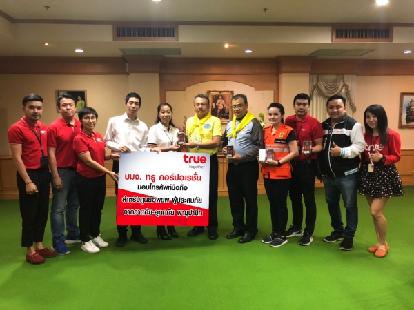 นายวิชวุทย์ จินโต ผู้ว่าราชการจังหวัดสุราษฎร์ธานี รับมอบสมาร์ทโฟน พร้อมซิมทรูมูฟ เอช จำนวน 10 ชุด จากผู้แทนทรูมูฟ เอช โดย นางสาวสุนทรี สุนทรชูเกียรติ ผู้จัดการทั่วไป ด้านการบริหารจัดการระดับภูมิภาค – ภาคใต้ตอนบน บมจ. ทรู คอร์ปอเรชั่น เพื่ออำนวยความสะดวกให้กับประชาชนที่ประสบผลกระทบจากพายุโซนร้อน ปาบึก ได้โทรฟรีทุกเครือข่ายพร้อมดาต้าตลอด 24 ชั่วโมง ณ ศูนย์บัญชาการเหตุการณ์จังหวัดสุราษฎร์ธานี