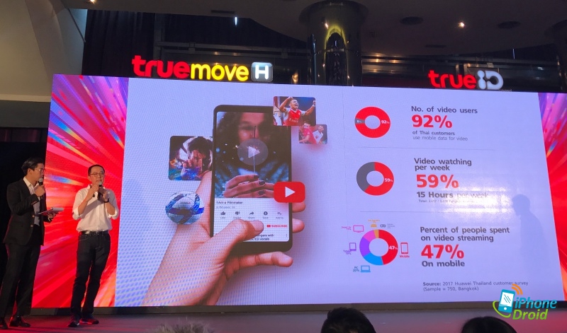 นายเจริญ ลิ่มกังวาฬมงคล หัวหน้าคณะผู้บริหารกลุ่ม ด้านการพาณิชย์ บมจ. ทรู คอร์ปอเรชั่นกล่าวว่า “ทรูมูฟ เอชผู้ให้บริการเครือข่าย 4G+ ที่ดีที่สุด ได้ศึกษาทำความเข้าใจเทรนด์และความต้องการของผู้บริโภคชาวไทยมาอย่างต่อเนื่อง เพื่อที่จะเดินหน้าพัฒนาสินค้าและบริการตอบโจทย์ทุกไลฟ์สไตล์ของลูกค้าได้อย่างตรงใจ พบว่า 92% ของผู้บริโภคชาวไทยที่ใช้ดาต้าใช้เพื่อดูวิดีโอ โดย 59 % ใช้ เวลา 15 ชั่วโมงต่อสัปดาห์ และ 47% ดูผ่านมือถือหรือสมาร์ทโฟน การดูหนังดูวิดีโอผ่านสมาร์ทโฟนซึ่งมีแนวโน้มเพิ่มสูงขึ้นอย่างต่อเนื่อง