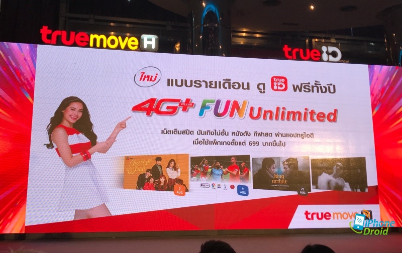อันเป็นผลมาจากทั้งอุปกรณ์สมาร์ทโฟนที่มีหน้าจอใหญ่ขึ้น ความชัดเจนของคอนเทนต์ระดับ HD และที่สำคัญเครือข่ายต้องมีคุณภาพสูงและมีความครอบคลุม ทรูมูฟ เอชจึงได้นำเทคโนโลยี 4.5 G มาต่อยอดพัฒนาเครือข่ายให้เป็น Best HD Network ดีที่สุดสำหรับการรับชม HD VDO และ HD Voice โดยให้ความคมชัดที่สุดระดับ HD ซึ่งจะช่วยให้ลูกค้าสนุกครบครันแบบไม่มีสะดุด โดยลูกค้าทรูมูฟเอชแบบรายเดือนเพียงเปิดแพ็กเกจใหม่ 4G+ FUN unlimited ราคาเริ่มต้น 699 – 1,899 บาทต่อเดือน และลูกค้าแบบเติมเงินเพียงเปิดซิมใหม่ Super Fun ราคา 49 บาท รับสิทธิพิเศษกว่าใคร ใช้บริการแอปพลิเคชั่น TrueID Premium HD ฟรีนาน 12 เดือน สนุกครบครัน ผ่านแอป TrueID เวอร์ชั่นใหม่ล่าสุด ทั้งชมกีฬา ดูหนัง ดูทีวี ฟังเพลง คมชัดระดับ HD ผ่านเน็ต 4G เต็มสปีดจากทรูมูฟ เอช สำหรับลูกค้ากลุ่มทรูรับสิทธิ์ใช้บริการ TrueID ฟรี 12 เดือน (3เดือนแรกเป็น Premium HD)”