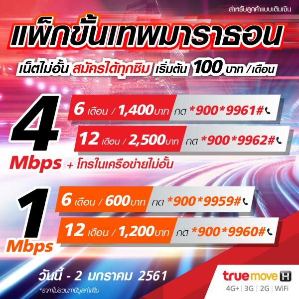 สำหรับลูกค้าทรูมูฟ เอช ระบบเติมเงินทุกซิม วันนี้-2 มกราคม 2561 เท่านั้น