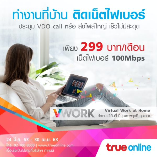 โปรพิเศษสำหรับคนทำงานที่บ้าน ด้วยเน็ตบ้านความเร็ว 100/100 Mbps เพียง 299 บาท/เดือน