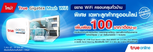 • True Gigatex MESH WiFi : อุปกรณ์เสริม ที่จะกระจายสัญญาณWiFi ให้ครอบคลุมทั่วพื้นที่บ้านที่มีขนาดใหญ่ได้มากขึ้น ไม่ต้องเดินสาย LAN มาพร้อมเทคโนโลยี Band Steering ในราคาเพียงเดือนละ 100 บาทต่อจุด โดยเลือกสมัครเพิ่มเติมได้ทุกแพ็กเกจ ซึ่งสามารถเพิ่มจุดติดตั้งอุปกรณ์เสริมดังกล่าว ได้สูงสุดถึง 2 จุด ต่อ 1 เลขหมายอินเทอร์เน็ต