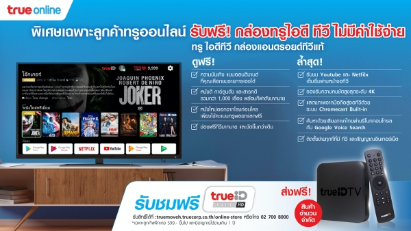 โดยทรูออนไลน์ พร้อมส่งมอบกล่อง TrueID TV ฟรี สำหรับลูกค้าทรูออนไลน์ แพ็กเกจ 599 บาทขึ้นไป และมีอายุการใช้งานมากกว่า 1 ปี ไม่ต้องเสียค่าบริการรายเดือนเพิ่ม โดย TrueID TV เป็นกล่องแอนดรอยด์ทีวีแท้ กล่องอัจฉริยะ ที่จะเปลี่ยนทีวีเดิมให้เป็นมากกว่าสมาร์ททีวีสามารถดูหนังดังระดับออสการ์ ดูช่องฟรีทีวีมากมาย พร้อมรับชมความบันเทิง แบบออนดีมานด์ ที่สามารถเลือกชมรายการเองได้ ในเวลาที่ต้องการ ทั้งหนังดีและการ์ตูน ฟรีกว่า 1,000 เรื่อง อีกทั้งยังสามารถดูหนังใหม่ที่เพิ่งออกจากโรงภาพยนตร์ได้อีกด้วย เพียงใช้คะแนนทรูพอยท์แลก เริ่มต้นเพียง 219 คะแนน หรือเงินสดเริ่มต้นเพียง 149 บาทเท่านั้น นอกจากนี้ ยังสามารถรับชม Youtube และ Netfilx แอปพลิเคชั่นสุดฮิต โดยสามารถแสดงภาพจากสมาร์ทโฟนสู่จอทีวี ด้วยระบบ Chromecast และยังค้นหาด้วยเสียงภาษาไทยผ่านรีโมทได้อีกด้วย ซึ่งมั่นใจได้ว่าสิทธิพิเศษ ที่ทรูออนไลน์ จัดให้ครั้งนี้ จะทำให้ลูกค้ามีความสุขและสนุกเต็มอิ่มกับการอยู่บ้านมากยิ่งขึ้น”