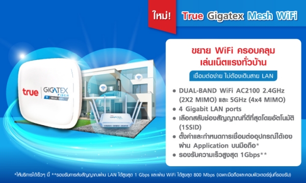 True Gigatex MESH WiFi เป็นอุปกรณ์เสริม ที่ช่วยกระจายสัญญาณ การใช้งาน WiFi ภายในบ้านให้ครอบคลุม แก้ปัญหาจุดอับสัญญาณ สามารถทำงานได้ทุกที่ในบ้าน ช่วยให้ work from home สะดวกยิ่งขึ้น อีกทั้งยังสามารถใช้งานได้พร้อมกันหลายดีไวซ์ รวมถึงอุปกรณ์ IOT ที่จะเปลี่ยนบ้านให้เป็นสมาร์ทโฮมโซลูชั่น ด้วยคุณสมบัติพิเศษที่สามารถกระจายสัญญาณ WiFi ได้ครอบคลุมทุกพื้นที่การใช้งานในบ้าน ตอบโจทย์ทุกความต้องการ True Gigatex MESH WiFi รุ่นใหม่ล่าสุดนี้ มาด้วยคุณสมบัติมาตรฐาน AC 2100 Dual Band 5GHz (4×4 MIMO) และ 2.4 GHz (2×2 MIMO) รองรับความเร็วสูงสุด 1 Gbps ผ่าน LAN และได้ความเร็วสูงสุด 800 Mbps ผ่าน WiFi เฉพาะคอมพิวเตอร์และมือถือรุ่นที่รองรับ พร้อมระบบ Band Steering ที่สามารถเปลี่ยนสัญญาณ WiFi ระหว่าง 5GHz และ 2.4 GHz ได้ตลอดเวลาบนชื่อเดียวกัน และจะเลือกสลับช่องสัญญาณ WiFi ที่ดีที่สุดให้โดยอัตโนมัติ ไม่ต้องเลือกสลับด้วยตัวเองอีกต่อไป อีกทั้งยังใช้ติดตั้งได้ง่าย ไม่ต้องเดินสาย LAN ให้ยุ่งยาก นอกจากนี้ยังสามารถตั้งค่าและกำหนดการเชื่อมต่ออุปกรณ์ได้เองผ่านแอปพลิเคชันบนมือถือ True Gigatex Fiber (พร้อมให้บริการในเร็วๆนี้)