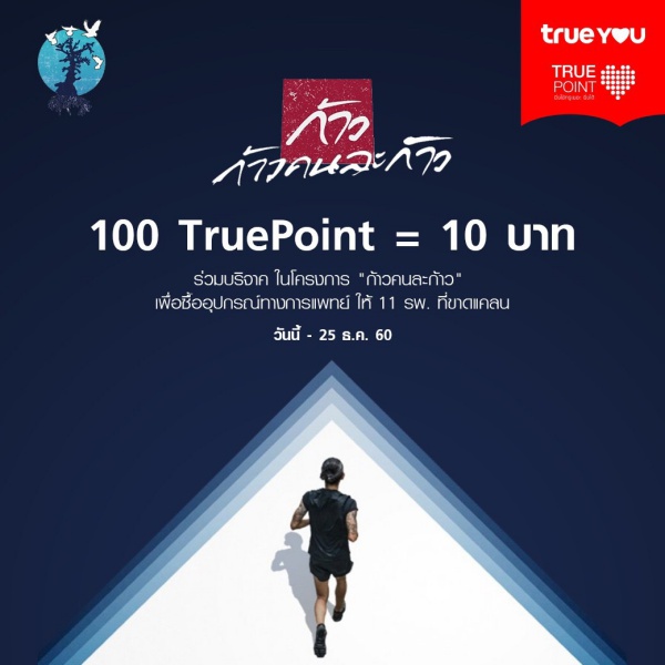 ทรูยูชวนคุณ ใช้ 100 TruePoint แทนเงิน 10 บาท ร่วมบริจาค เพื่อสนับสนุนโครงการ “ก้าวคนละก้าว” ซึ่งตูน บอดี้สแลมจะออกวิ่ง จากสุดเขตแดนใต้ อำเภอ เบตง จังหวัดยะลา ไปจนถึง เหนือสุดแดนสยาม อำเภอแม่สาย จังหวัด เชียงราย รวมระยะทาง 2,191 กม. ผ่าน 20 จังหวัด เพื่อรับบริจาคซื้ออุปกรณ์
