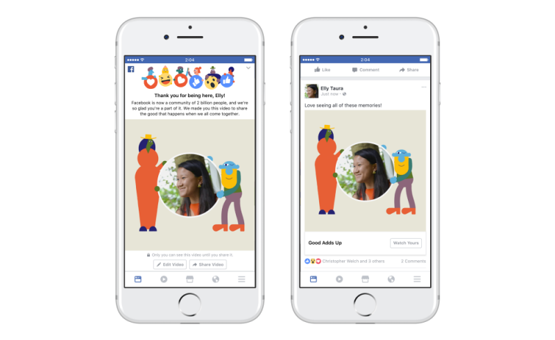 Facebook ได้เพิ่มหน้าเว็บเพจ Good Adds Up Video (facebook.com/goodaddsup) เพื่อสรุปสถิติที่น่าสนในของผู้ใช้งานแต่ละคนว่าในปีที่ผ่านมาเคยกดถูกใจโพสต์ไปเท่าไหร่ และเดือนที่ผ่านมากดเพิ่มเพื่อนไปมากขนาดไหน รวมไปถึงการมีส่วนร่วมในกลุ่มหรือ Groups แล้วสามารถแชร์วิดีโอไปบน Facebook ได้ด้วย (อาจต้องรอการประมวลผลวิดีโอสักพักสำหรับผู้ใช้งานบางคน)