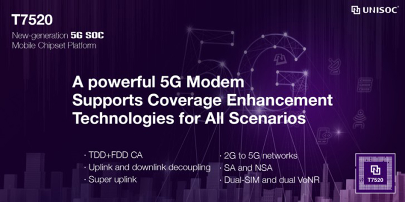 ภายในของ Unisoc T7520 ยังฝังโมเด็ม 5G เข้าไปในตัว รองรับทั้ง sub-6GHz, mmWave, SA และ NSA โดยสามารถทำความเร็วในการอัปโหลดสูงสุด 3.25Gbps ซึ่งการประหยัดพลังงานยังมากกว่า Snapdragon 865 และ Exynos 990 ที่ต้องใช้โมเด็มแยก 5G อยู่ถึง 35%