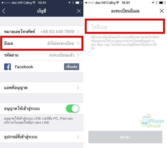 เข้าไปที่ การตั้งค่า > บัญชี > อีเมล์ > ใส่อีเมล์ ที่ต้องการลงทะเบียน (ในกรณีที่ยังไม่เคยตั้งรหัสผ่าน ระบบจะให้ตั้งรหัสผ่านสำหรับล็อคอินใช้ LINE ที่หน้าลงทะเบียนอีเมล์ด้วยนะครับ)