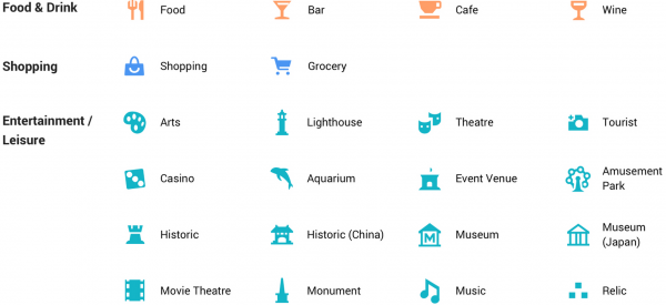 จะเห็นได้ว่าสถานที่จุดสำคัญต่างๆ ได้มีการปรับโทนสีแบ่งแยกประเภทไว้เป็นอย่างดีทำให้ดูสบายตายิ่งขึ้นและแบ่งแยกประเภทของสถานที่ได้ง่ายมากขึ้น ยกตัวอย่างเช่น ร้านอาหารจะเป็นไอคอนสีส้ม แหล่งช้อปปิ้งจะเป็นสีน้ำเงิน โรงพยาบาลจะเป็นสีชมพู สถานบันเทิงจะเป็นสีเขียวน้ำทะเล