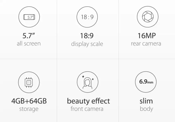 - หน้าจอ 5.7 นิ้ว (1440 x 720 พิกเซล) all screen 18 : 9