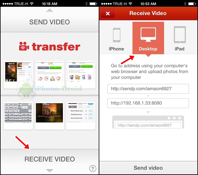 มาดูวิธีส่งภาพหรือวีดีโอเข้าไปที่คอมพิวเตอร์กันบ้าง เลือกไปที่ Sent to Computer จากนั้นพิมพ์ address ที่ browser ที่เราใช้บนคอมตามที่แอพกำหนดให้แบบด้านล่างนี้นะครับ
