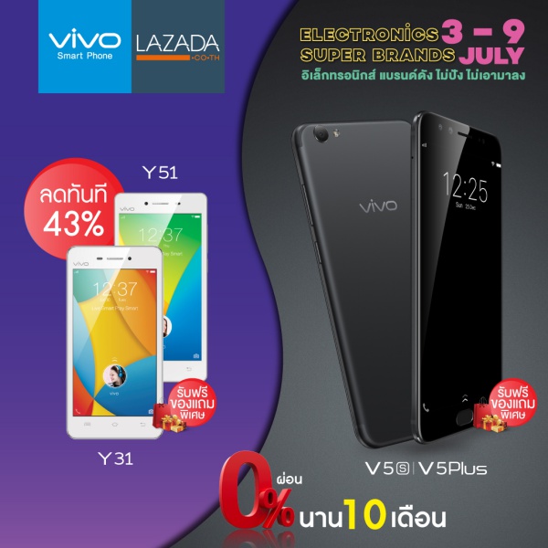 Vivo เข้าร่วมแคมเปญใหญ่กับ Lazada “Electronics Super Brands อิเล็กทรอนิกส์ แบรนด์ดัง ไม่ปัง ไม่เอามาลง” 3-9 กรกฏาคม 2560 นี้ Vivo พารุ่นน้องเก่าแต่ไฟแรง และ รุ่นน้องใหม่ไฟแรงเฟ่อร์ มามอบโปรโมชั่นสุดพิเศษ ให้กับแฟนๆ คนรัก  วีโว่