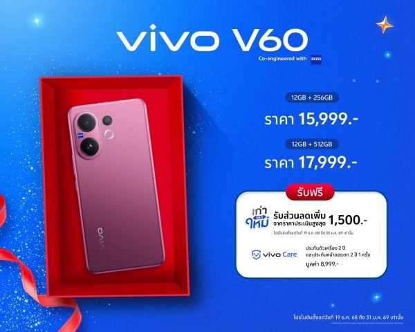 สำหรับผู้ที่สนใจ เทศกาลแห่งความสุขปีนี้ vivo เตรียมเสิร์ฟของขวัญพิเศษสำหรับผู้ที่สั่งซื้อ vivo V60 ภายในวันที่ 31 มกราคม 2569 ด้วยสิทธิประโยชน์ vivo Care ประกันตัวเครื่อง 2 ปี และประกันหน้าจอแตก 2 ปี 1 ครั้ง พร้อมรับส่วนลดเพิ่มจากการแลกเปลี่ยนเครื่องเก่าสูงสุดถึง 1,500 บาท