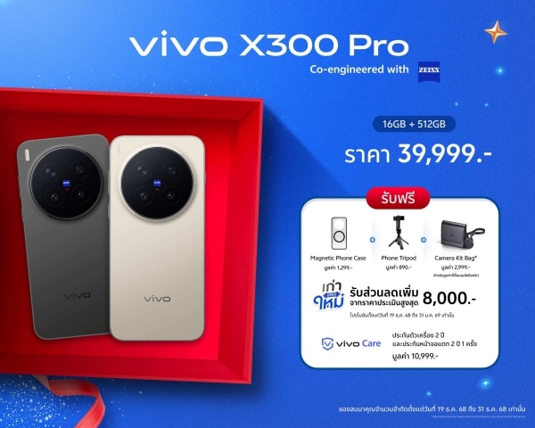 เพื่อส่งมอบความสุขส่งท้ายปี vivo จัดโปรโมชันสำหรับผู้ที่สั่งซื้อภายในวันที่ 31 ธันวาคม 2568 มอบสิทธิรับของสมนาคุณพิเศษ ได้แก่ เคสสมาร์ตโฟนแม่เหล็ก (Magnetic Phone Case) มูลค่า 1,299 บาท ขาตั้งสมาร์ตโฟน (Phone Tripod) มูลค่า 890 บาท และกระเป๋า X300 Series Camera Kit Bag มูลค่า 2,999 บาท (เฉพาะลูกค้าที่ซื้อชุดเลนส์เสริม หรือ กริป) พร้อมรับส่วนลดเพิ่มจากการแลกเปลี่ยนเครื่องเก่าสูงสุดถึง 8,000 บาท!