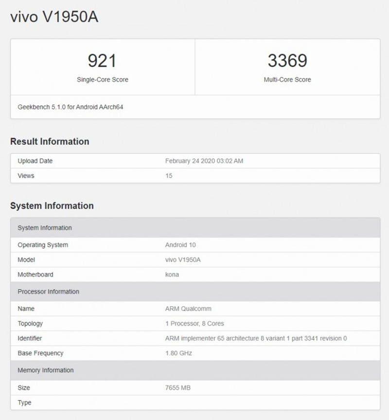 รุ่นดังกล่าวจะมาพร้อมกับ RAM 8GB และรันบน Android 10 โดยคาดว่าจะครอบทับด้วย Funtouch OS 10 โดยคะแนนก็ถือว่าทำในระดับที่ดีมากที่ Single-core 921 คะแนน และ Multi-core 3,369 คะแนน