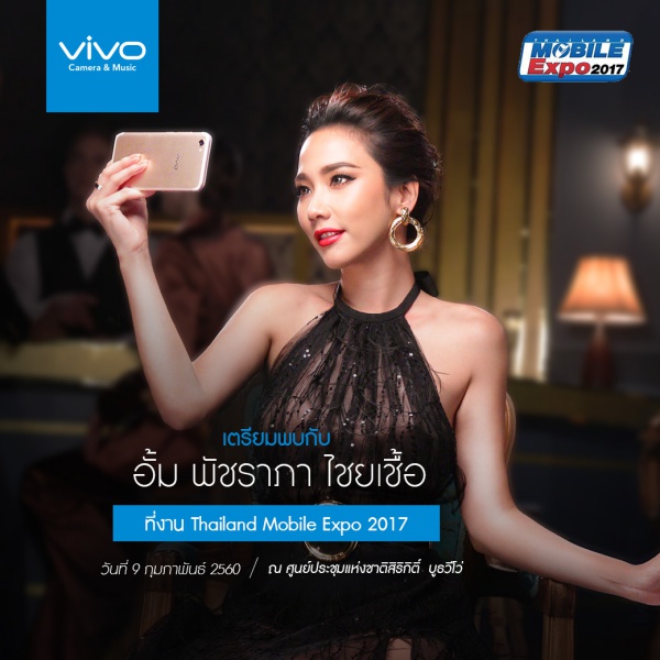 Vivo จัดโปรโมชั่นสนั่นงาน ไทยแลนด์ โมบาย เอ็กซ์โป 2017(Thailand Mobile Expo 2017) เอาใจคนรักการเซลฟี่ ส่งแบรนด์แอมบาสเดอร์ ตัวแม่เบอร์หนึ่งของวงการบันเทิงไทย อั้ม-พัชราภา ไชยเชื้อ ตอกย้ำความเป็น Queen of Selfie พร้อมเผยโฉม สุดยอดสมาร์ทโฟนแห่งยุค Vivo V5Plus กล้องหน้าเลนส์คู่ความละเอียด 20 ล้านพิกเซล ล้ำกว่ากับ Selfie Softlight กล้องหน้าพร้อมแสงแฟลช เร็ว แรง ทุกประสิทธิภาพด้วย RAM 4GB + Rom 64GB มาพร้อมกล้องหลังความละเอียด 16 ล้านพิกเซล ที่สุดแห่งเทคโนโลยีชาร์จเร็ว ให้คุณเพอร์เฟกต์ได้ทุกการเซลฟี่ และอีกหลากรุ่น หลากหลายความล้ำสมัย ที่จะเผยทุกรายละเอียดและโปรโมชั่นสุดพิเศษในงาน