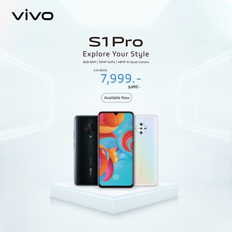 Vivo ปรับราคารุ่นสุดฮอตที่โดนใจหลาย ๆ คนอย่าง  Vivo S1 Pro   มาพร้อม AI Quad Camera กล้องหลักความละเอียด 48 ล้านพิกเซล  ทั้งยังมาพร้อมเลนส์ wide-angle เลนส์ macro และเลนส์ bokeh โดย S1 Pro กับการเป็นผู้นำกล้องหน้าสุดคมชัด ด้วยความละเอียดสูงถึง 32 ล้านพิกเซล ถ่ายภาพได้อย่างสมบูรณ์ในทุกรายละเอียด  S1 Pro ปลดล็อกหน้าจอด้วยลายนิ้วมือ พร้อมด้วยไอคอนใหม่และแอนิเมชันปลดล็อกหลากหลายรูปแบบที่จะนำความสนุกมาให้คุณ Vivo S1 Pro มาพร้อมกับแบตเตอรี่ขนาดใหญ่ 4500mAh (TYP) USB Type-C พร้อมด้วยเทคโนโลยีชาร์จเร็วสุดเฉพาะของ Vivo กับ Dual-Engine Fast Charging  S1 Pro มาพร้อมกับหน่วยประมวลผล Qualcomm Snapdragon Octa-core พร้อมด้วย RAM 8GB ที่ช่วยให้คุณใช้งานได้อย่างไหลลื่นและ ROM 128GB พื้นที่จัดเก็บขนาดใหญ่ ทั้งยังรองรับหน่วยความจำได้สูงสุด 256GB