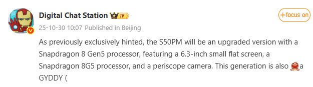 จอมหลุดเจ้าเดิมอย่าง digital Chat Station (DCS) บอกว่า S50 Pro mini ในฝั่งจีน หรือ X300 FE ในฝั่ง Global จะใช้ขุมพลังตัวรองท็อปรุ่นใหม่ Snapdragon 8 Gen 5 (ไม่ใช่ Snapdragon 8 Elite Gen 5) ปรับจาก MediaTek ที่ใช้มาในรุ่นที่แล้วครับ