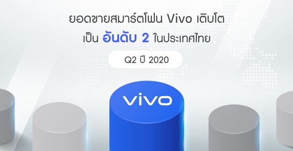 Canalys เผยข้อมูลยอดขายสมาร์ตโฟนในประเทศไทย (นับจำนวนเครื่อง) ในช่วงไตรมาสที่ 2 ของปี 2563 Vivo ครองยอดขายขึ้นเป็นอันดับ 2 ในประเทศไทย โดยมีอัตราการเติบโตถึง 26% Canalys บริษัทวิเคราะห์ตลาดเทคโนโลยีชั้นนำระดับโลก รายงานผลการวิเคราะห์ตลาดสมาร์ตโฟนในประเทศไทย โดยอิงจากหน่วยการจัดส่งของแต่ละแบรนด์ในไตรมาสล่าสุดว่า Vivo ยังคงครองตำแหน่งหนึ่งใน 3 แบรนด์สมาร์ตโฟนชั้นนำในเอเชียตะวันออกเฉียงใต้ด้วยยอดส่งที่เติบโตในอัตราปีละ 20%