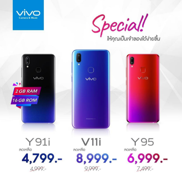 ทั้งหมดนี้ไม่ว่าจะ Vivo V11i จากราคาเดิม 9,999 บาท เหลือเพียง 8,999 บาท Vivo Y95 จากราคาเดิม 7,499 บาท เหลือเพียง 6,999 บาท Vivo Y91i จากราคาเดิม 4,999 บาท เหลือเพียง 4,799 บาทเท่านั้น โดยจะเริ่มปรับราคาตั้งแต่วันนี้เป็นต้นไป หากท่านใดที่สนใจสามารถจับจองเป็นเจ้าของได้ที่ตัวแทนจัดจำหน่ายสมาร์ทโฟนชั้นนำทั่วประเทศ ผู้ที่สนใจสามารถติดตามรายละเอียดเพิ่มเติมได้ ทาง http://www.vivo.co.th