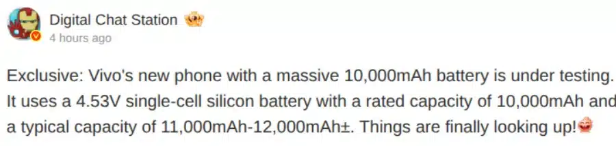 DCS โพสต์ผ่าน Weibo ว่าแบตเตอรี่มากกว่า 10000mAh ของ vivo อยู่ในการทดสอบแล้ว โดยใช้เป็นแบตฯ ซิลิคอนคาร์บอนแบบ 4.53V โดยมีความจุขั้นต่ำ 10000mAh และความจุทั่วไปอยู่ที่ระหว่าง 11000mAh – 12000mAh