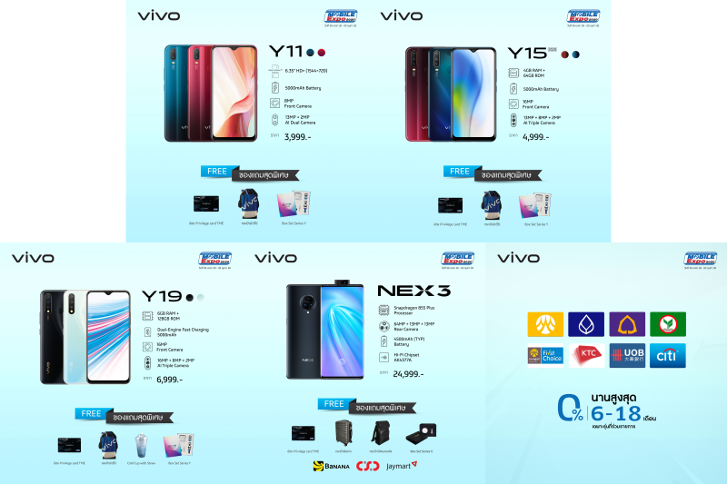 - Vivo NEX 3 ที่มีสเปคระดับท็อปจัดเต็มความแรงมากมาย หน้าจอแสดงผลแบบ Waterfall Screen ดีไซน์แบบ Unibody design สเปคเทพภายในเครื่องใช้ ชิปเซ็ตเรือธงรุ่นใหม่ล่าสุดอย่าง Qualcomm Snapdragon 855 Plus และ RAM 8GB + ROM 128GB อัดแน่นระบบเสียงสุด Hi-Fi ด้วยชิปเสียง AK4377A สุดเฉพาะของ Vivo เพลิดเพลินไปกับประสบการณ์ทางดนตรีอันดื่มด่ำยิ่งขึ้น ภายในงานยังได้พบกับโปรโมชั่นของแถมจัดเต็มไม่ว่าจะเป็น บัตร Privillege Card TME , กระเป๋าล้อลาก , กระเป๋าสะพายข้าง , Box Set Series V ทั้งหมดนี้ในราคาเพียง 24,999 บาท ที่ทุกท่านจะสามารถพบได้ที่บูธ BANANA , CSC , Jaymart เท่านั้น