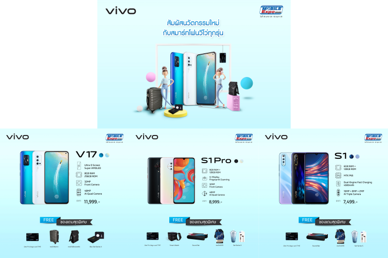 - Vivo V17 กับสโลแกน “ ฉีกทุกกฎในทุกช็อต ” มาพร้อมหน้าจอ Ultra O Screen ความคมชัดระดับ FHD+ ขนาด 6.44 นิ้ว สร้างกล้องหน้าสุดพิเศษความละเอียดสูง 32 ล้านพิกเซล กล้องหลัง 4 ตัวที่ทรงพลัง กล้องหลัก 48 ล้านพิกเซล เลนส์ Super Wide-Angle 8 ล้านพิกเซล เลนส์ Macro 2 ล้านพิกเซล และเลนส์ Bokeh 2 ล้านพิกเซล บันทึกได้ทุกความมหัศจรรย์ด้วยกล้องหลังเพียงแค่ 4 ตัว เร็วแรงกับ RAM 8GB + ROM 256GB อีกด้วย ภายในงานยังได้พบกับโปรโมชั่นของแถมจัดเต็มไม่ว่าจะเป็น บัตร Privillege Card TME , กระเป๋าล้อลาก , กระเป๋าสะพายข้าง , Box Set Series V ทั้งหมดนี้ในราคาเพียง 11,999 บาท เท่านั้น