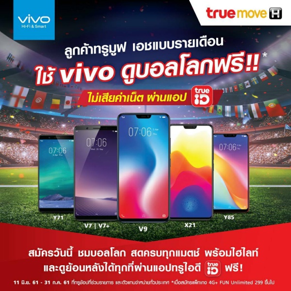 โดยในขณะนี้ทรูมูฟ เอช มีแคมเปญพิเศษสุด สำหรับลูกค้าเปิดเบอร์ใหม่ ,เปลี่ยนจากเติมเงินเป็นรายเดือน หรือ ย้ายค่ายเบอร์เดิมมาทรูมูฟ เอช แบบ รายเดือน ที่ซื้อเครื่องพร้อมสมัครแพ็กเกจ 4G+ FUN Unlimited 299 ขึ้นไป ระยะสัญญา 12 เดือน ภายในวันที่11 มิถุนายน ถึง 31 กรกฏาคม 2561 นี้ ลูกค้าจะได้รับสิทธิ์ดูบอลโลกฟรีผ่านแอปทรูไอดี ชมถ่ายทอดสดบอลโลกแบบเต็มๆ 64 แมทช์ ไม่ว่าจะดูสด ดูรีรัน หรือถ้าอยากดูรายการอื่นๆ บนแอปทรูไอดี ก็ดูฟรีได้เช่นกันไม่เสียค่าเน็ต และที่พิเศษไปมากกว่านั้น สำหรับลูกค้าที่ใช้สมาร์ทโฟน Vivo และใช้เครือข่ายทรูมูฟ เอช อยู่แล้วก็จะได้รับสิทธิพิเศษนี้เหมือนกัน ทั้งนี้ลูกค้าจะได้รับข้อความแจ้งสิทธิ์ ผ่านทางโทรศัพท์โดยอัตโนมัติ และในตอนนี้มีโปรโมชั่นสุดพิเศษสำหรับ Vivo V9 และ Vivo Y85 ท่านใดสนใจสามารถสอบถามได้ที่ทรูช้อป และร้านค้าที่ร่วมรายการ