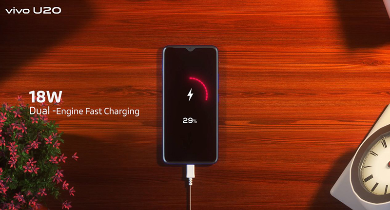 Vivo U20 มาพร้อมกับหน้าจอแสดงผลทรงหยดน้ำชนิด IPS ขนาด 6.53 นิ้ว ความละเอียด FHD+ (2340 x 1080 พิกเซล) มีพื้นที่การแสดงผลถึง 90.3% ใช้หน่วยประมวลผล Snapdragon 675, RAM 4/6GB + ROM 64GB และแบตเตอรี่ความจุ 5000mAh รองรับ Fast Charge 18W ผ่านพอร์ต Micro USB 2.0