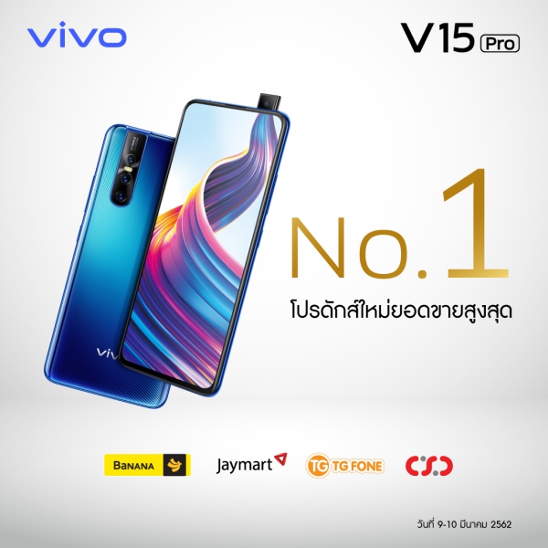 เป็นที่น่ายินดีสำหรับสมาร์ทโฟนนวัตกรรมสุดล้ำรุ่นใหม่ล่าสุดของ Vivo อย่าง Vivo V15Pro หลังจากที่ได้เปิดให้ทำการ Pre -Order ไปเมื่อวันที่ 1 – 8 มีนาคม 2562 ที่ผ่านมา ในราคาเพียง 14,999 บาท ต้องยอมรับว่า Vivo V15 Pro ทำยอดจองถล่มทลาย เนื่องจากเป็นโปรดักส์ที่มีนวัตกรรมกล้อง Pop Up กล้องหน้า 32 ล้านพิเซล และหน้าจอไร้ขอบอย่างแท้จริง รุ่นแรกในไทย จึงได้การตอบรับอย่างดีเยี่ยม จนถึงวันขายอย่างเป็นทางการ ซึ่งล่าสุด เมื่อวันที่ 9 – 10 มีนาคม 2562 ที่ผ่านมา ยอดขายของ Vivo V15 Pro ทำยอดขายขึ้นเป็นอันดับ 1 จากพาร์ทเนอร์ลูกค้ารายใหญ่ ได้แก่ Banana , Jaymart , TG FONE , CSC