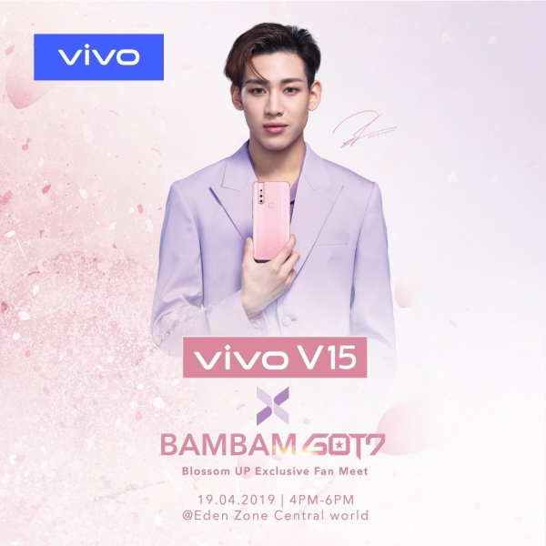 Vivo เตรียมจัดงานสุดฟินให้เหล่าอากาเซได้ฮือฮาอีกครั้ง กับงาน Vivo V15 x BAMBAM GOT7 Blossom UP Exclusive Fan Meet ที่จะจัดขึ้นในวันที่ 19 เมษายน 2562 นี้ โดยงานนี้เหล่าอากาเซและแฟนๆ Vivo จะได้พบกับพรีเซนเตอร์หนุ่มสุดหล่อ อย่างหนุ่ม แบมแบม กันต์พิมุกต์ ภูวกุล หรือ BAMBAM GOT7 ที่จะมามอบความสุขและเล่าประสบการณ์ให้บรรดาแฟนคลับของ Vivo ได้ฟังกัน และพร้อมให้แฟนๆ ทุกท่านสัมผัสความมันส์กันแบบ Exclusive