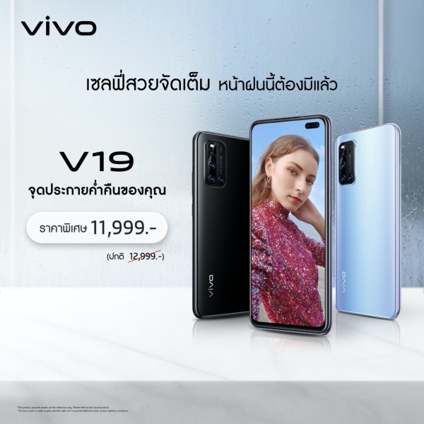 Vivo ปรับลดราคา Vivo V19 ที่มาพร้อม หน้าจอ Super AMOLED FHD+ ขนาด 6.44 นิ้ว หน้าจอแบบ Ultra O Screen และกล้องหน้าคู่สุดคมชัด 32MP กล้องหลัก 32 ล้านพิกเซล + เลนส์ Super Wide-Angle 8 ล้านพิกเซล และในกล้องหลัง กล้องหลักความละเอียด 48 ล้านพิกเซล กล้อง Super Wide-Angle 8 ล้านพิกเซล กล้อง Macro 2 ล้านพิกเซล และกล้อง Bokeh 2 ล้านพิกเซล กล้อง AI สี่เลนส์ 48 ล้านพิกเซล ครอบคลุมทุกการถ่ายภาพ Vivo 19 มาพร้อม AI Super Night Mode เวอร์ชั่นใหม่ สามารถจับภาพถ่ายในระดับแสงที่แตกต่างกันหลายๆภาพในระยะเวลาอันสั้นเพื่อนำมารวมกัน วิเคราะห์ปรับค่าความสว่าง และความคมชัดของภาพให้สมบูรณ์แบบยิ่งขึ้นด้วยความสามารถในการถ่ายภาพในที่แสง น้อยของ V19 ช่วยให้คุณเปล่งประกายได้แม้ในเวลากลางคืน อีกทั้งยังมีสัมผัสพลังอันทรงประสิทธิภาพด้วยหน่วย ประมวลผล Qualcomm Snapdragon Octa-core 712 พร้อมด้วย RAM 8GB และ ROM 128GB ให้พื้นที่ จัดเก็บข้อมูลของคุณมากยิ่งขึ้น Vivo V19 ยังให้เทคโนโลยีชาร์จไว 33W vivo FlashCharge 2.0 เพียง 30 นาทีชาร์จได้ถึง 54% ทั้งยังมาพร้อมด้วยแบตเตอรี่ขนาดใหญ่ 4500mAh ให้คุณเพลิดเพลินกับการใช้งานได้อย่างยาวนาน