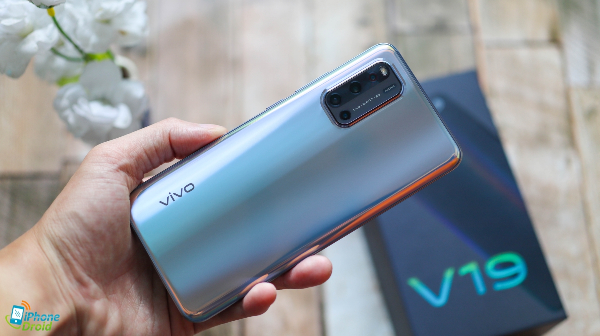 Vivo V19 ใช้ดีไซน์ที่มีความงามมากๆ ด้วยวัสดุกระจกที่ด้านหลัง โดยเครื่องสีเงินที่เราได้มาก็แทบจะไม่ต่างกับการส่องกระจกจริงๆ มีการเล่นเฉดสีเล็กๆ และตัวเครื่องก็มีความโค้งจับได้ถนัดมือด้วย