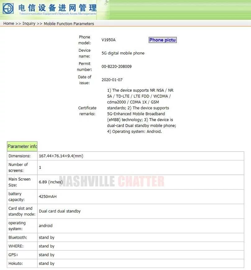 สำหรับโมเดล V1950A คาดการณ์ว่าจะเป็น Vivo NEX 3 5G รุ่นใหม่เพราะมีสเปคคล้ายรุ่นก่อนที่เปิดตัวไปมาก โดยมาพร้อมหน้าจอขนาด 6.89 นิ้ว และมีแบตเตอรี่ความจุ 4250mAh ขณะที่บน 3C ระบุว่ารองรับ Fast Charge 44W และเครือข่าย 5G ด้วย