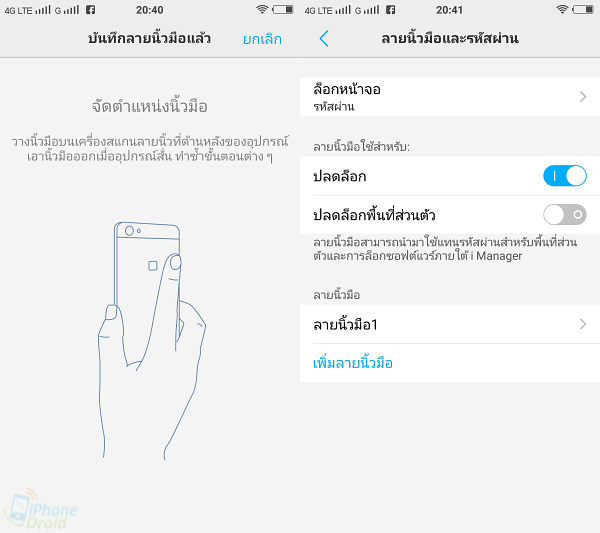 ระบบลายนิ้วมือรองรับการใช้งานสำหรับปลดล็อกหน้าจอ และใช้แทนรหัสผ่านสำหรับพื้นที่ส่วนตัว