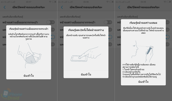 - หน้าจอสว่างอัจฉริยะ เป็นการเปิดหน้าจอใช้งานโดยอัตโนมัติผ่านการสั่งงาน ได้แก่ เมื่อหยิบออกจากกระเป๋า, แตะหน้าจอ 2 ครั้งขณะหน้าจอปิดอยู่ และหน้าจอจะไม่ดับเมื่อมองหน้าจออยู่